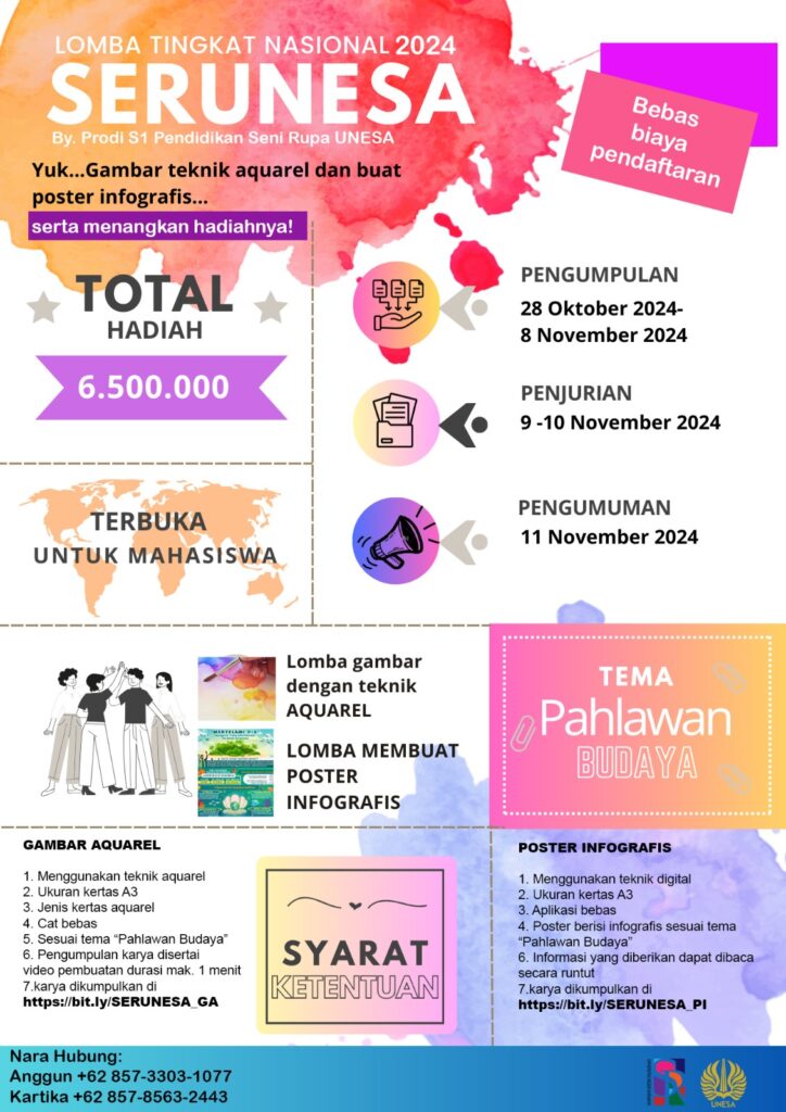 Ajang SERUNESA 2024 sendiri merupakan bagian dari rangkaian kegiatan ilmiah dan seni yang bertujuan menggali potensi mahasiswa di bidang seni rupa dan desain visual, mempertemukan ide-ide kreatif dari berbagai perguruan tinggi di Indonesia.