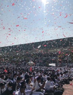 Peresmian pembukaan PBAK ditandai dengan hitungan 5,4,3,2,1 oleh Bapak rektor lalu dilanjutkan dengan penembakan confetti diiringi tepuk tangan meriah dari para mahasiswa.
